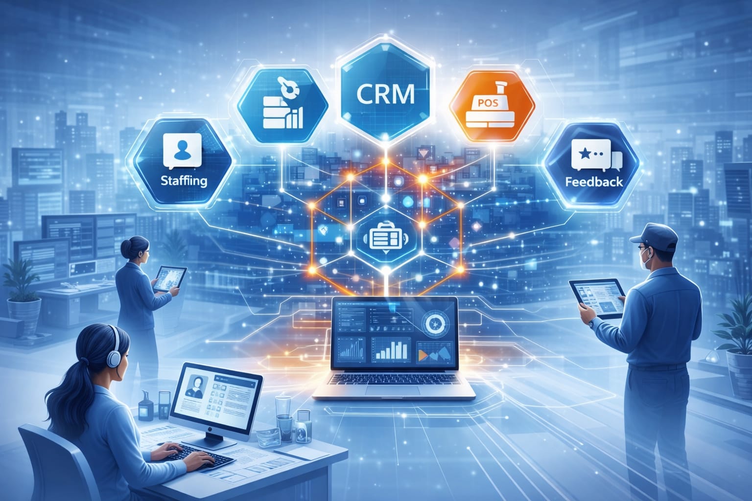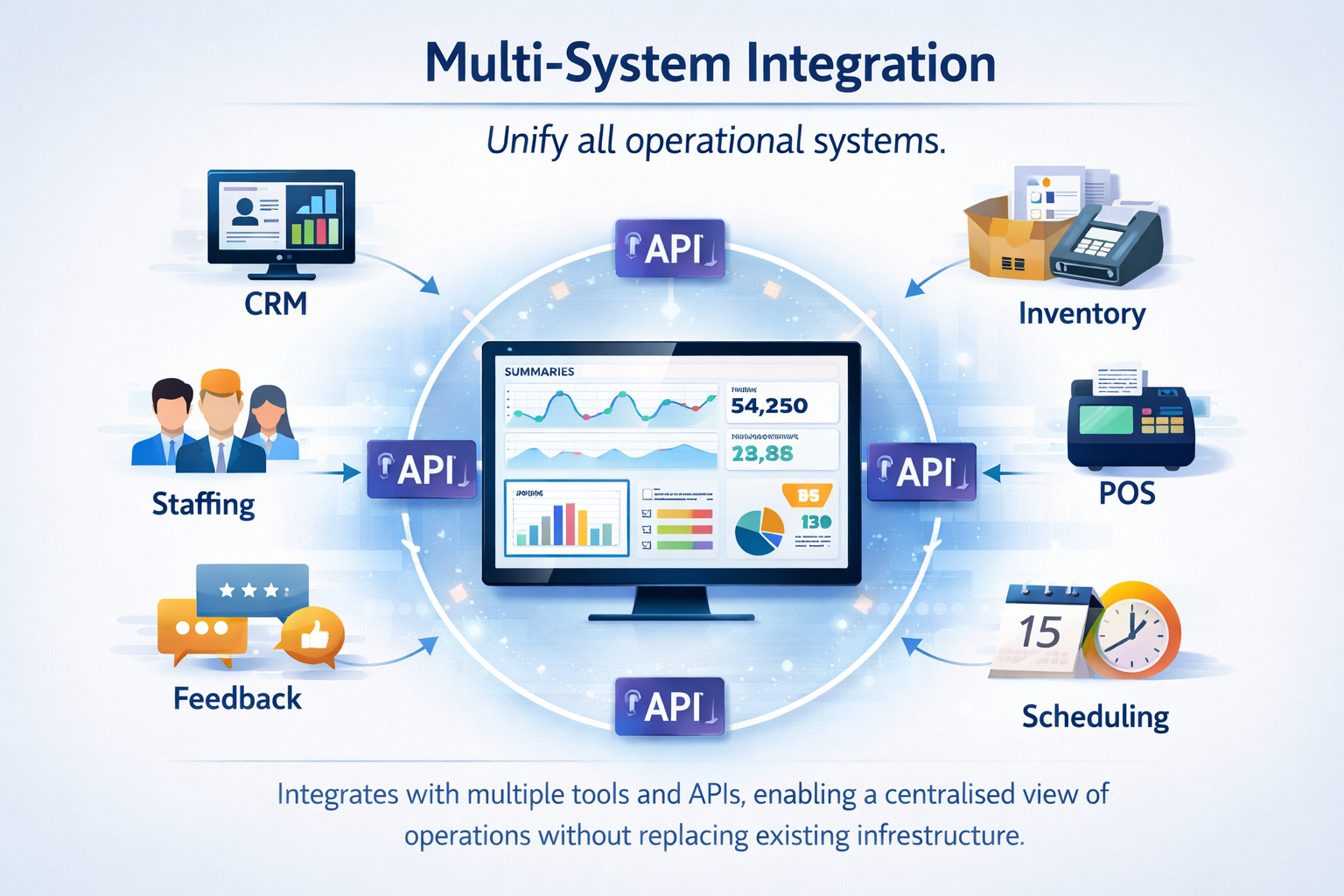 Connects with CRM, POS, staffing, and feedback tools to collect real-time operational and customer interaction data across the business.